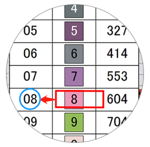 Quindi fai riferimento alla legenda sul lato della tua tela o alla guida cartacea e noti che il numero del filo da selezionare, qui nella colonna di sinistra, cerchiato in blu, è il numero 8. (Noterai la somiglianza tra il simbolo della tela, che è un quadrato rosa con un 8, e il numero del filo da ricamo, che è anche il numero 8).
