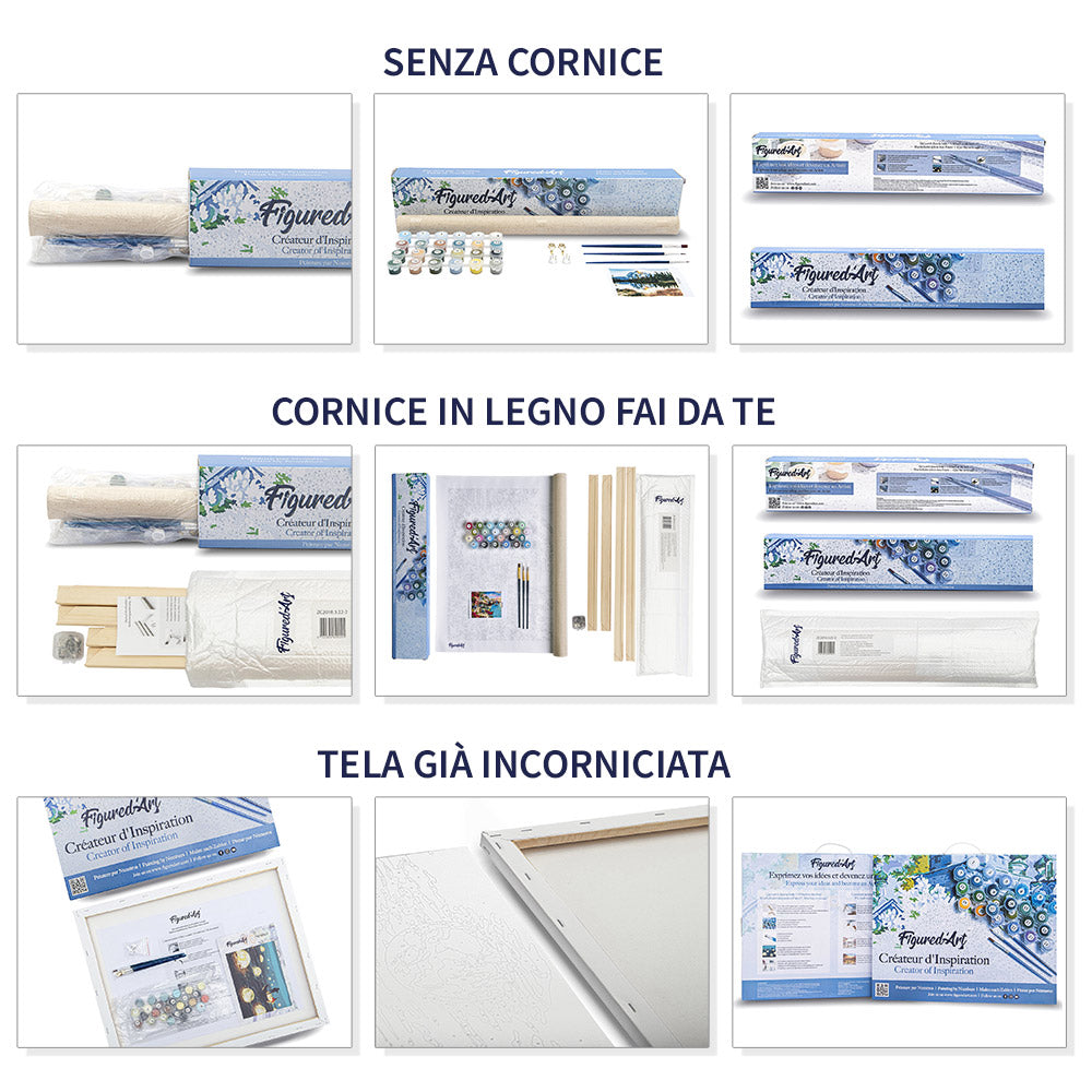 Kit completo di tela da Dipingere con i Numeri arrotolata senza pieghe e cornice in legno da assemblare.