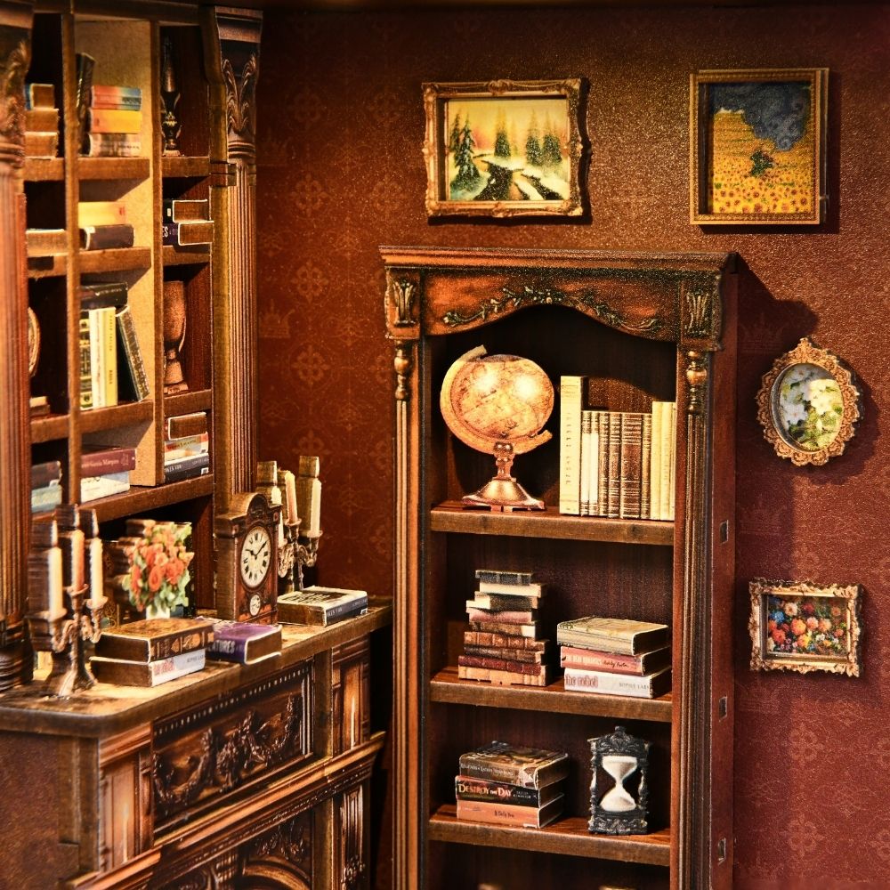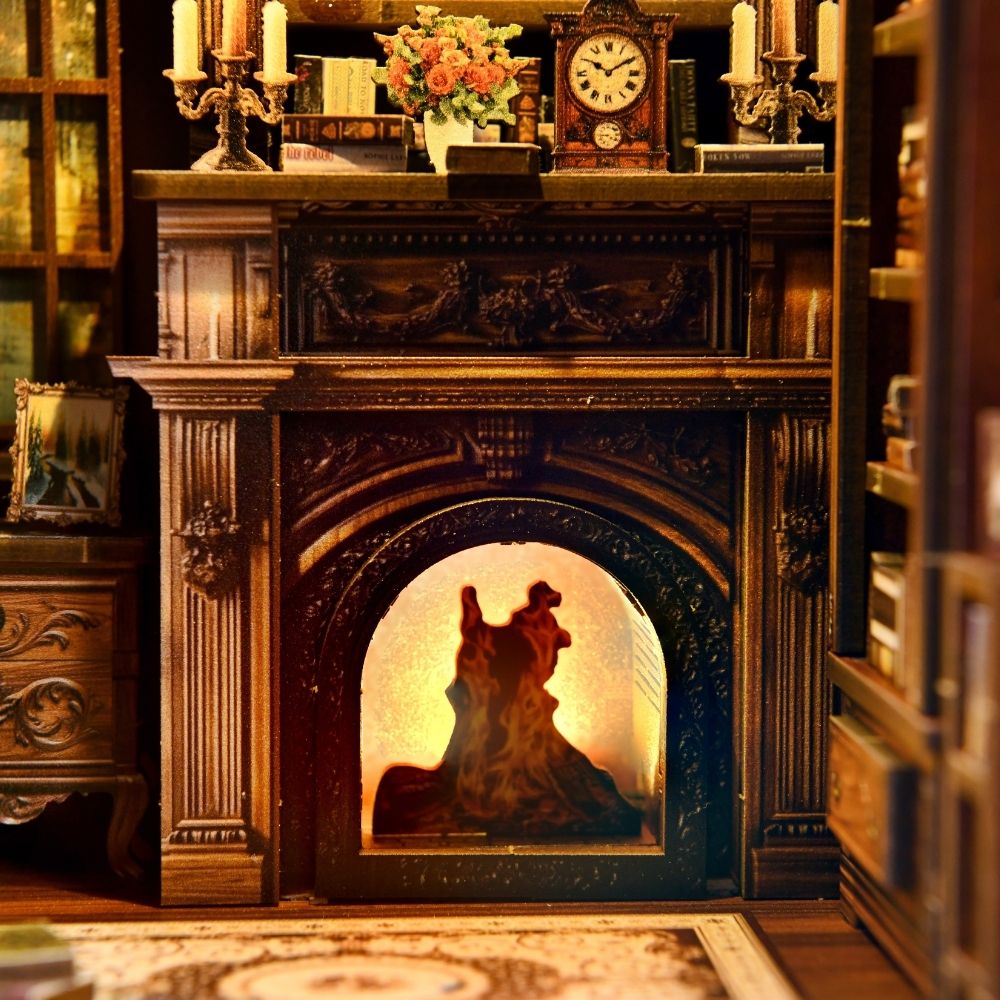 Un book nook che racconta una storia: una comoda seduta di fronte al camino acceso invita a fermarsi e sognare. Tra scaffali di libri, candelabri, un antico orologio a pendolo e un mappamondo, ogni dettaglio è curato con eleganza. L’atmosfera è calda, avvolgente e senza tempo, perfetta per rendere unica la tua libreria.