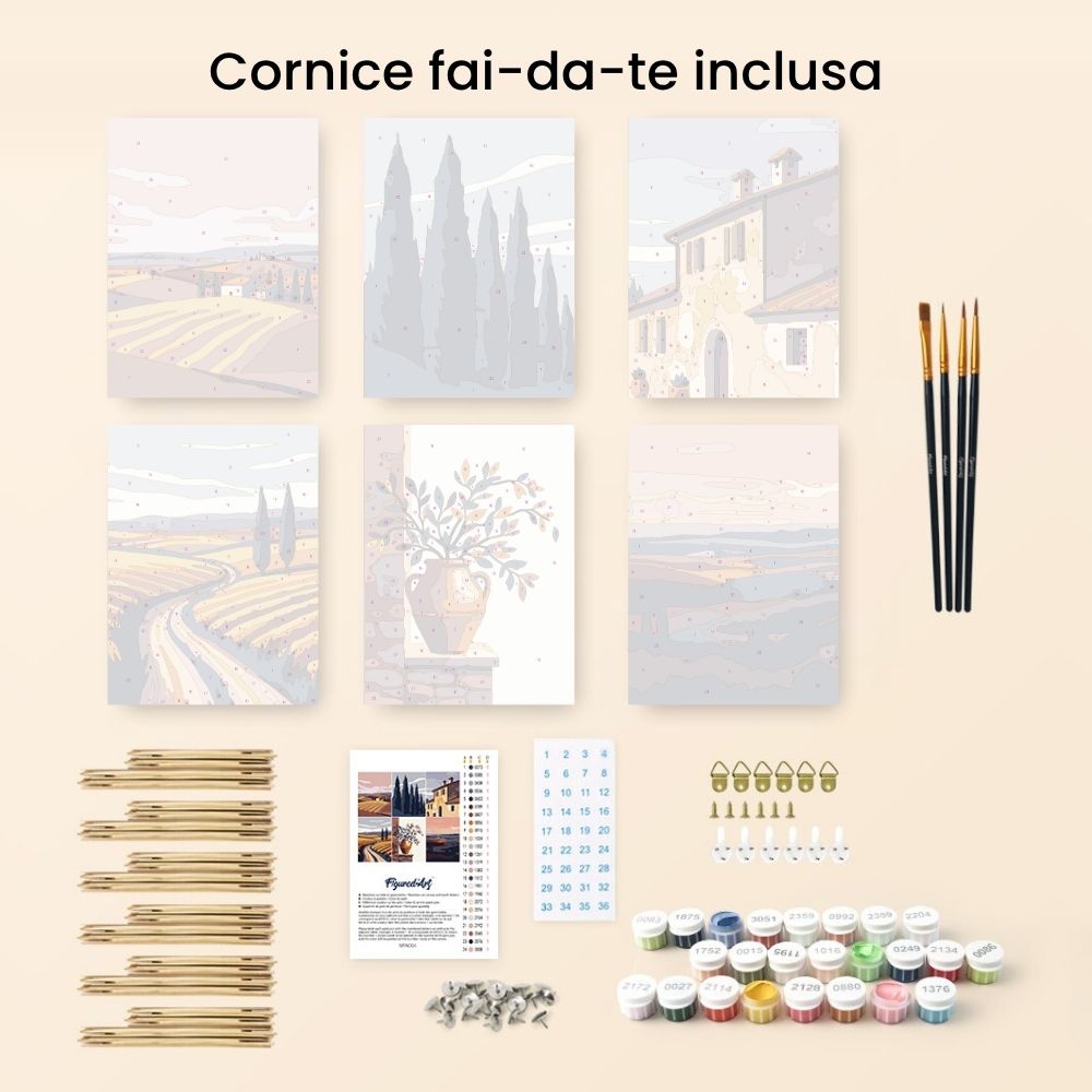 Classic Tuscany contiene 6 incantevoli tele ispirate agli accoglienti paesaggi della Toscana.Vigneti che si estendono tra dolci colline, casali rustici e uliveti baciati dal sole prendono forma attraverso tonalità calde e naturali. Questi design da dipingere con i numeri celebrano la ricca cultura e la bellezza mozzafiato di una delle regioni più amate dell'Italia, perfetti per portare un tocco del suo fascino in ogni ambiente.