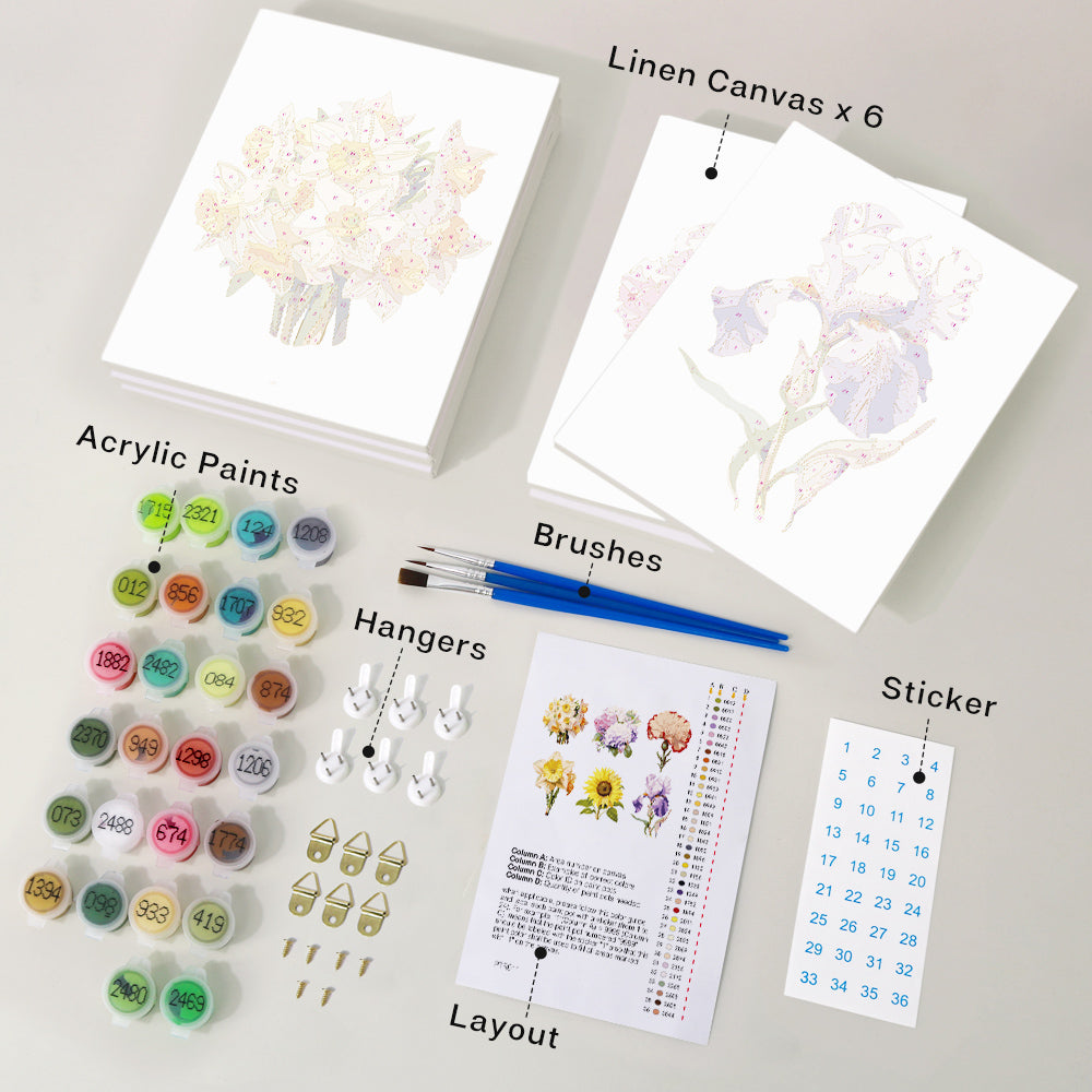 Questo kit di Dipingere con i numeri contiene tutto il materiale necessario per creare la tua opera d'arte: