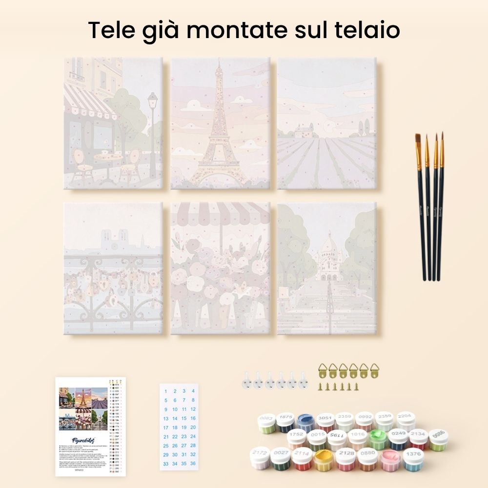 Il set Francia Romantica include sei design da dipingere con i numeri che celebrano la bellezza e il fascino della Francia. Dalla celebre Torre Eiffel ai profumati campi di lavanda della Provenza, fino all'elegante silhouette della “Grand Mother”, a una graziosa fioreria e all'atmosfera accogliente dei caffè locali: ogni tela racconta una diversa sfumatura della vita francese. Insieme, evocano l'eleganza, il calore e l'intramontabile art de vivre di questo Paese.