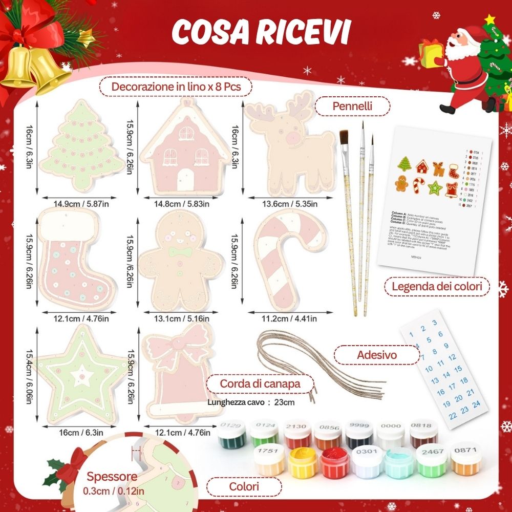 Avvolgi le tue feste di calore e creatività con questi set di Decorazioni Natalizie da Dipingere con i Numeri. Questi splendidi addobbi richiamano l'atmosfera calda di un pomeriggio invernale al profumo di biscotti e cannella. Ogni pezzo di legno ha la forma dei classici natalizi: omini di pan di zenzero, casette, stelle e molto altro, pronti per essere dipinti con i caldi colori delle feste. Un modo divertente e creativo per decorare il tuo albero aggiungendo il tuo tocco personale. Ogni pezzo cattura lo spirito gioioso del Natale e il comfort invernale, rendendo un'aggiunta speciale alla tue decorazioni natalizie. Segui semplicemente i numeri e guarda i tuoi ornamenti prendere vita con colore e fascino.
