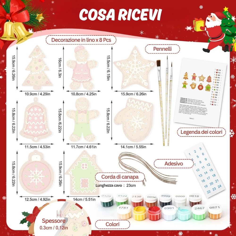 Avvolgi le tue feste di calore e creatività con questi set di Decorazioni Natalizie da Dipingere con i Numeri. Questi splendidi addobbi richiamano l'atmosfera calda di un pomeriggio invernale al profumo di biscotti e cannella. Ogni pezzo di legno ha la forma dei classici natalizi: omini di pan di zenzero, casette, stelle e molto altro, pronti per essere dipinti con i caldi colori delle feste. Un modo divertente e creativo per decorare il tuo albero aggiungendo il tuo tocco personale. Ogni pezzo cattura lo spirito gioioso del Natale e il comfort invernale, rendendo un'aggiunta speciale alla tue decorazioni natalizie. Segui semplicemente i numeri e guarda i tuoi ornamenti prendere vita con colore e fascino.