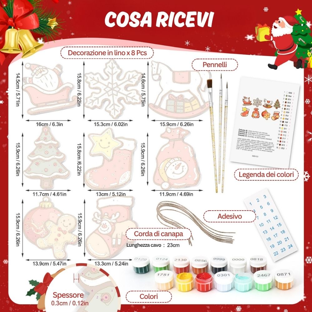 Avvolgi le tue feste di calore e creatività con questi set di Decorazioni Natalizie da Dipingere con i Numeri. Questi splendidi addobbi richiamano l'atmosfera calda di un pomeriggio invernale al profumo di biscotti e cannella. Ogni pezzo di legno ha la forma dei classici natalizi: omini di pan di zenzero, casette, stelle e molto altro, pronti per essere dipinti con i caldi colori delle feste. Un modo divertente e creativo per decorare il tuo albero aggiungendo il tuo tocco personale. Ogni pezzo cattura lo spirito gioioso del Natale e il comfort invernale, rendendo un'aggiunta speciale alla tue decorazioni natalizie. Segui semplicemente i numeri e guarda i tuoi ornamenti prendere vita con colore e fascino.