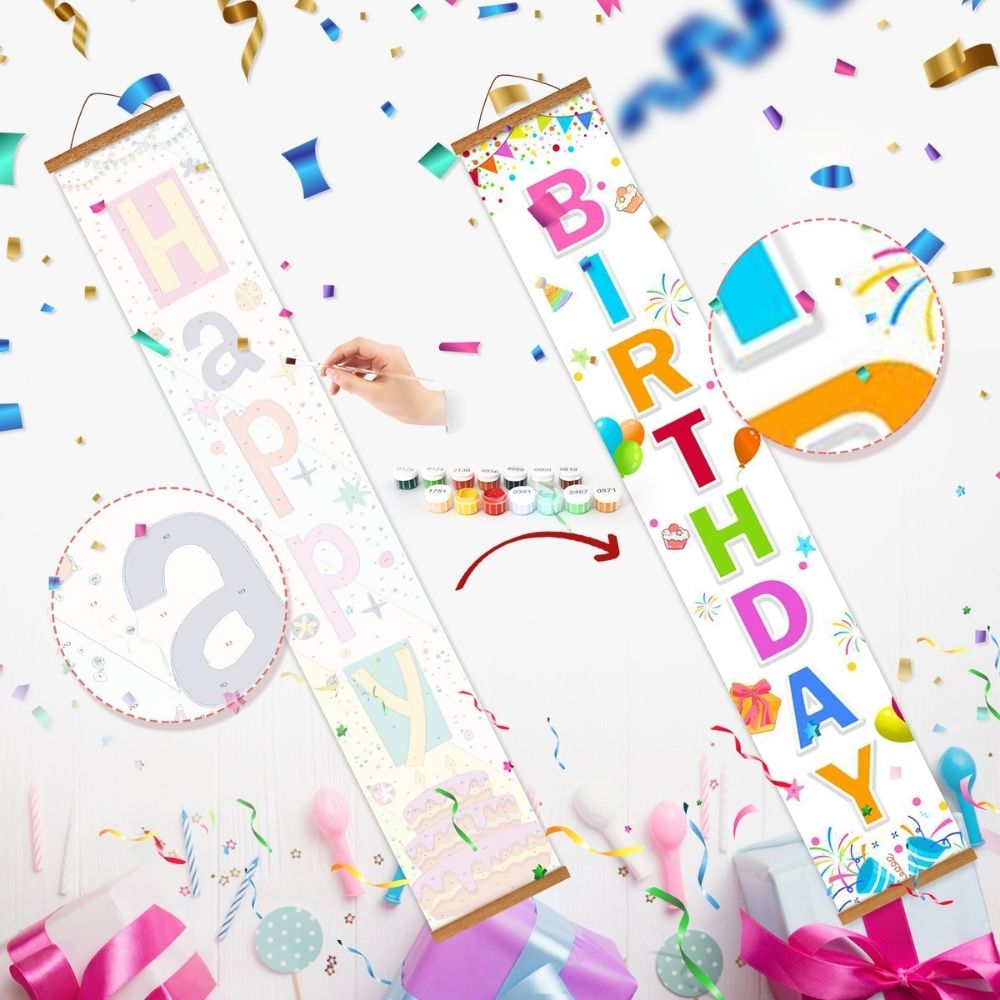 Decora il tuo ingresso in modo unico e gioioso con queste vivaci decorazioni a tema compleanno! Il set per Dipingere con i Numeri Decorazioni per Porte - Coriandoli Festivi aggiunge colore, divertimento e personalità alle tue feste. Ogni kit pittura include due banner splendidamente decorati (20×120 cm), perfetti per illuminare ingressi, porte e pareti. Ideale per ambienti interni ed esterni, questi festoni aggiungono subito fascino a qualsiasi casa, giardino o spazio per le celebrazioni.