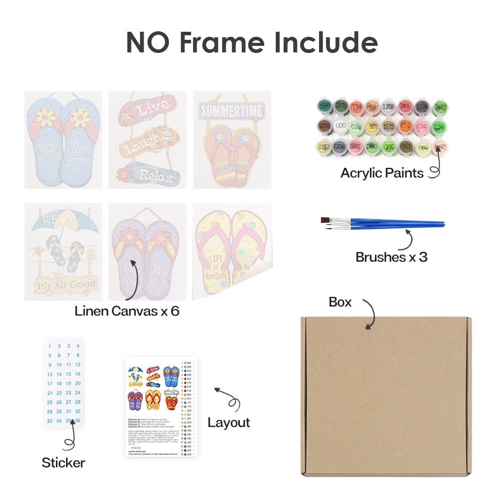 Scopri la gioia di dipingere con il nostro Set di 6 tele – Dipingere con i numeri | Infradito estive decorative. Ogni kit include sei tele a tema, colori acrilici pre-miscelati e tutti gli strumenti necessari. Segui la guida numerata per goderti un hobby rilassante e creare splendide opere d’arte di cui sarai orgoglioso da esporre o regalare.