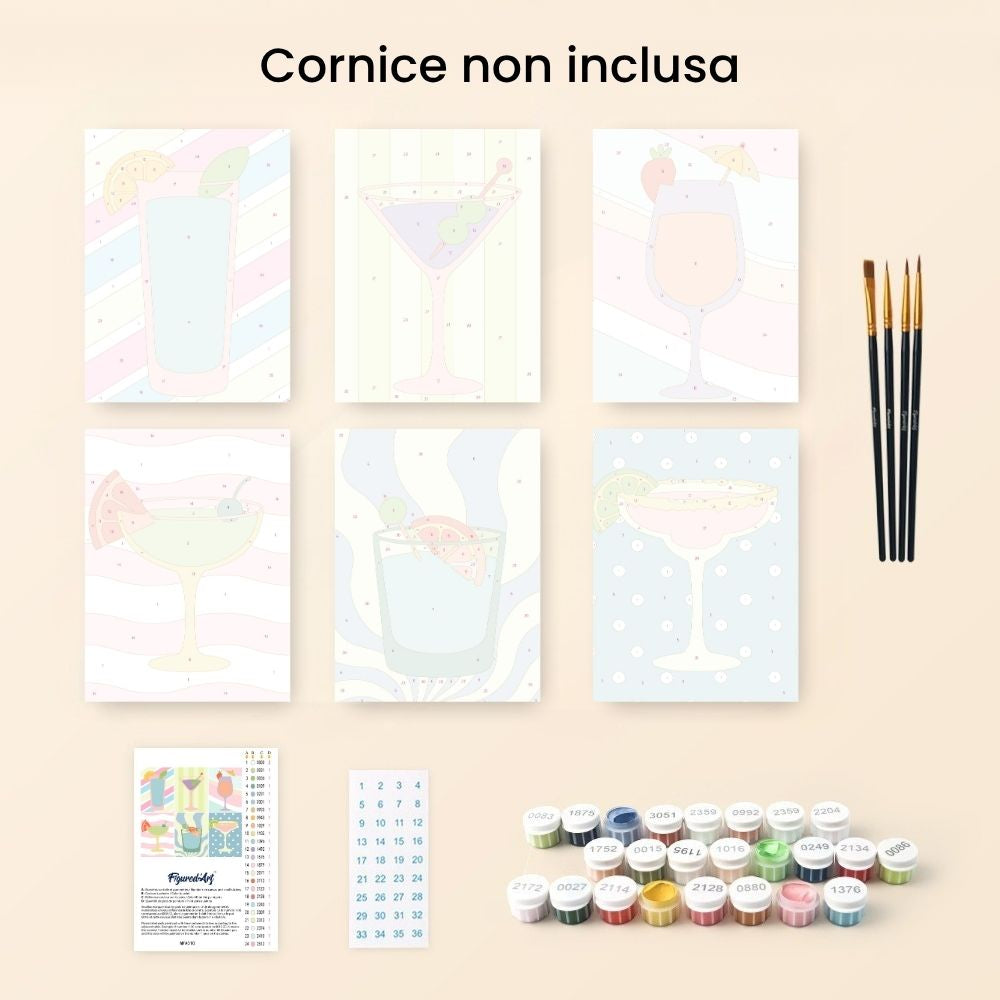 Con il kit Cocktail Pop Art, brinda con sei vivaci design da dipingere con i numeri ispirati al mondo dei cocktail. Dai classici martini ai colorati drink tropicali, fino alle decorazioni più raffinate, ogni creazione evoca un'atmosfera festosa ed elegante. Perfetto per accogliere gli ospiti o aggiungere un tocco di stile e sofisticatezza a qualsiasi ambiente.