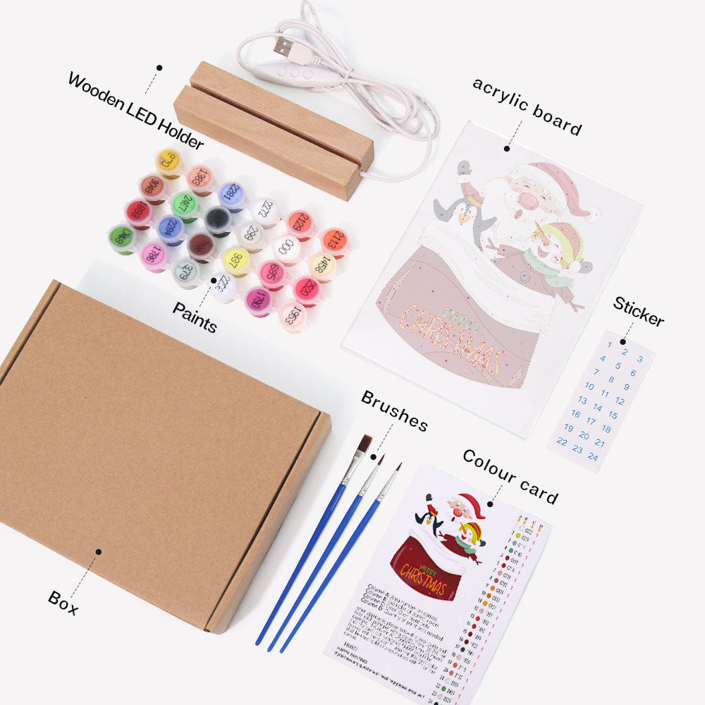 Questo kit festivo di Dipingere con i numeri nel formato 15x20cm con base espositiva in legno con luce LED contiene tutto ciò di cui hai bisogno per creare il tuo capolavoro delle feste: