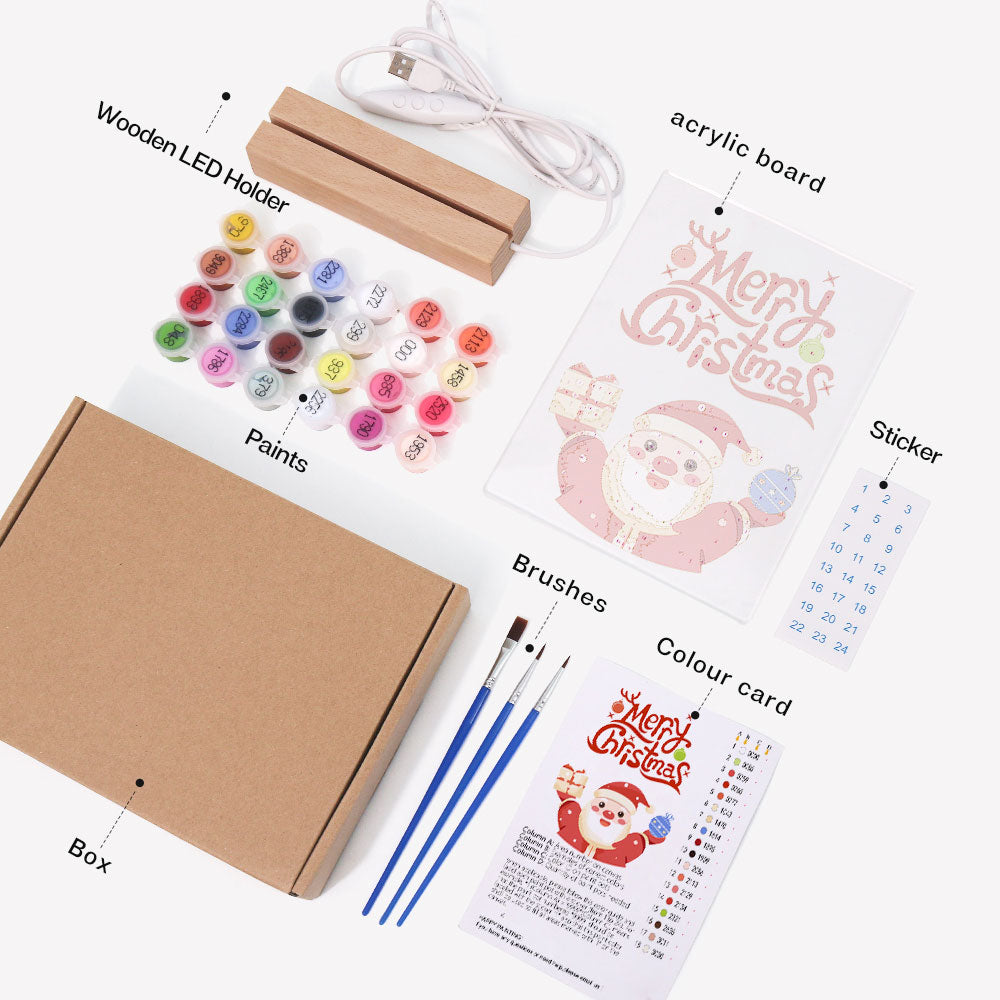 Questo kit festivo di Dipingere con i numeri nel formato 15x20cm con base espositiva in legno con luce LED contiene tutto ciò di cui hai bisogno per creare il tuo capolavoro delle feste: