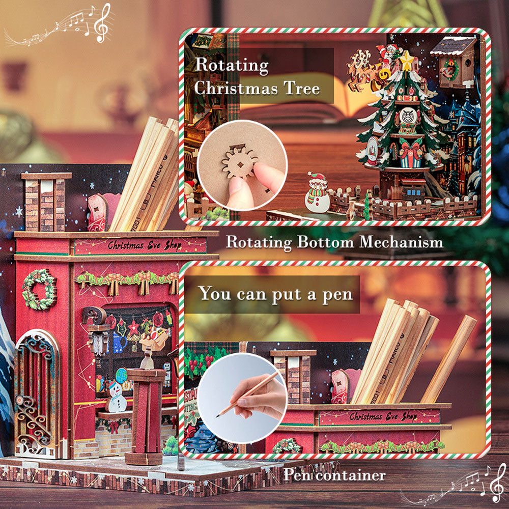 Il kit include elementi speciali come un albero di Natale rotante, che aggiunge un tocco giocoso e rende la scena ancora più interattiva. Un porta-penne integrato offre un tocco funzionale, mantenendo l'ordine sul tuo tavolo e aggiungendo un elemento decorativo unico.