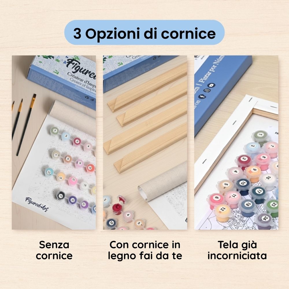Kit completo di tela da Dipingere con i Numeri arrotolata senza pieghe e cornice in legno da assemblare.